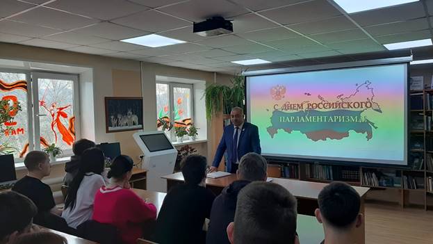 В библиотеке колледжа к этой дате приурочен совместный формат с Российским обществом «Знание»: просмотр тематической лекции «ДНК России. Как устроена Государственная Дума?» об истории российского парламентаризма – легендарном Новгородском вече, Земском соборе и Совете народных депутатов. с последующим обсуждением в формате открытого микрофона. Тема сложная, но неизменно вызывает горячий интерес и живые дискуссии! И, конечно, в нашем колледже традиционно организуются встречи с депутатами, которые делятся тонкостями работы Думы, отвечают на вопросы, а также с нашими студентами – членами Молодежного Парламента НГО, которые проводят для своих сверстников Уроки Парламентаризма. У нас в гостях побывал депутат Эльсевар Габибов. Он пояснил учащимся как избираются депутаты, разъяснил, что входит в обязанность депутатов Думы Находкинского городского округа, какие вопросы рассматриваются на постоянных депутатских комиссиях и заседаниях Думы.
