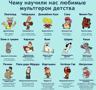 Советские и российские мультфильмы, через показ житейских ситуаций, воспитывают в нас добрые чувства: отзывчивость, взаимопонимание, взаимопомощь, учат нас никогда не сдаваться и верить в себя.