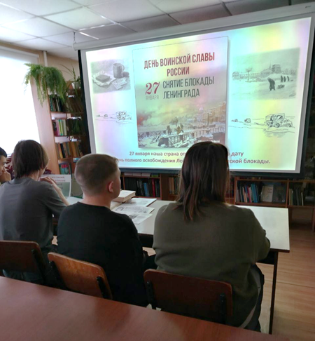 Библиотекари центральной детской юношеской библиотеки побывали в гостях у студентов колледжа. Встреча была посвящена Дню воинской славы России - 27 января, снятию блокады Ленинграда.