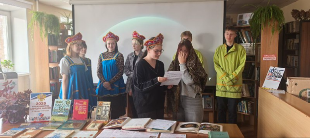 В библиотеке организована выставка тематической литературы. Студенты приняли участие в игровой программе «Однажды в России», где примерили на себя роли жителей разных уголков нашей огромной страны.