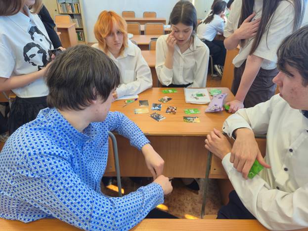 Изучая яркие фрагменты на карточках, ученики приводили примеры с какой профессией ассоциируется картинка, а также узнали о компетенциях чемпионатного движения. Участники фантазировали, общались, делились своими планами по дальнейшему выбору профессионального пути.