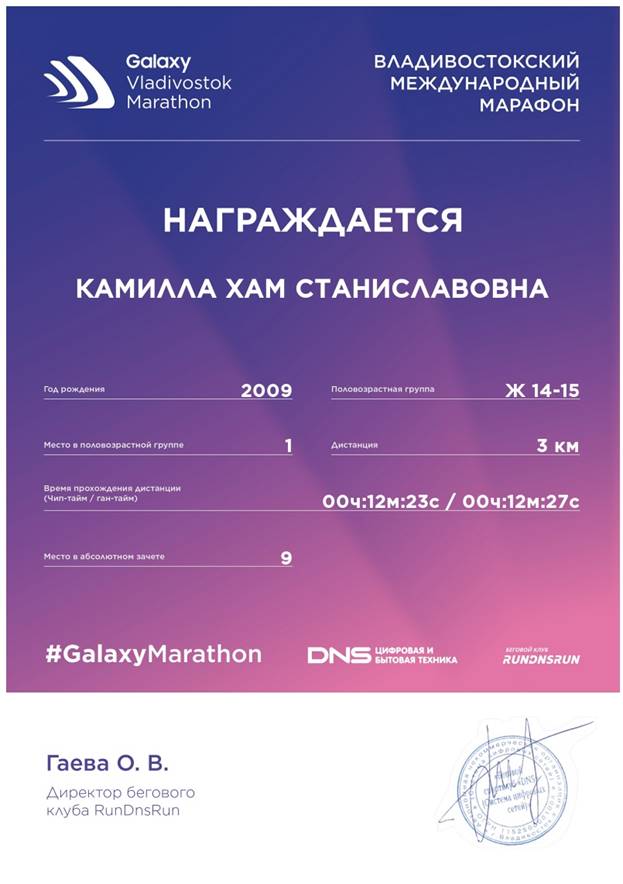 Хам Камилла вновь продемонстрировала свои навыки, пробежав дистанцию 3 км. В общем зачёте она заняла 9 место, а в своей возрастной категории стала первой! Это выдающееся достижение говорит о её целеустремлённости и работоспособности.