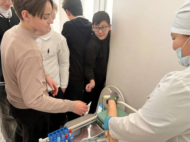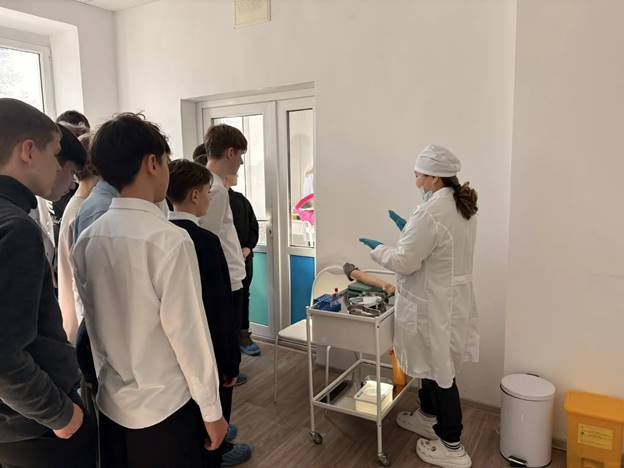 Наши студенты специальности Лечебное дело Черных Кирилл, Степанова Юлия, Германенко Галина и Ким Екатерина совместно с преподавателем Кузнецовой Евгенией Ивановной ознакомили школьников с профессиями «фельдшер» и «медицинская сестра», показали медицинские мастерские колледжа, рассказали об основных правилах подготовки процедурного кабинета к работе и перешли к следующему этапу проведения таких манипуляций, как парентеральное введение лекарственных средств (внутримышечное и внутривенное введение лекарственных средств).