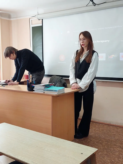 Также была проведена встреча с бывшими участниками, призерами чемпионата по профессиональному мастерству «Профессионалы» Костровой Ксенией Михайловной и Давыдовым Сергеем Артёмовичем. Ребята рассказали школьникам о самом Чемпионате, познакомили с опытом подготовки к нему и поделились своими успехами и достижениями. Сергей Артёмович познакомил школьников с чемпионатным движением «Профессионалы» по компетенциям, показал профориентационные ролики и прокомментировал их по нашим специальностям. Школьники смотрели и слушали с удовольствием, задавали интересующие вопросы.